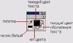 - Color (Цвет) — группа параметров в правой верхней части палитры (см. рис. 12.16), с помощью которых определяются цветовые установки текста. Для отображения текста используются два цвета: цвет линии обрамления и цвет внутренней части текста. Таким образом, если добавлена линия обрамления некоторой ширины, то сочетание двух цветов позволяет добиться дополнительных эффектов оформления (см. рис. 12.19, 12.20). Инструмент Eyedropper (Пипетка) позволяет "зачерпнуть" цвет из любого места кадра композиции. После нажатия кнопки с изображением пипетки временно — до первого щелчка — включается инструмент Eyedropper (Пипетка). Помимо применения пипетки, любой из доступных текущих цветов может быть выбран при помощи диалогового окна выбора цвета, загружающегося после щелчка на поле отображения текущего цвета;