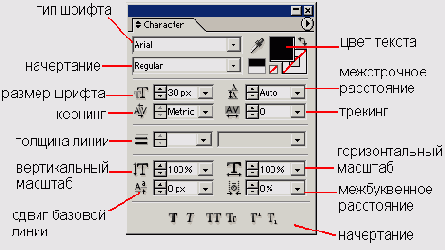 - палитра Character (Символ) — применяется для форматирования атрибутов символов, таких как тип и размер шрифта, цвет текста и т. п.;